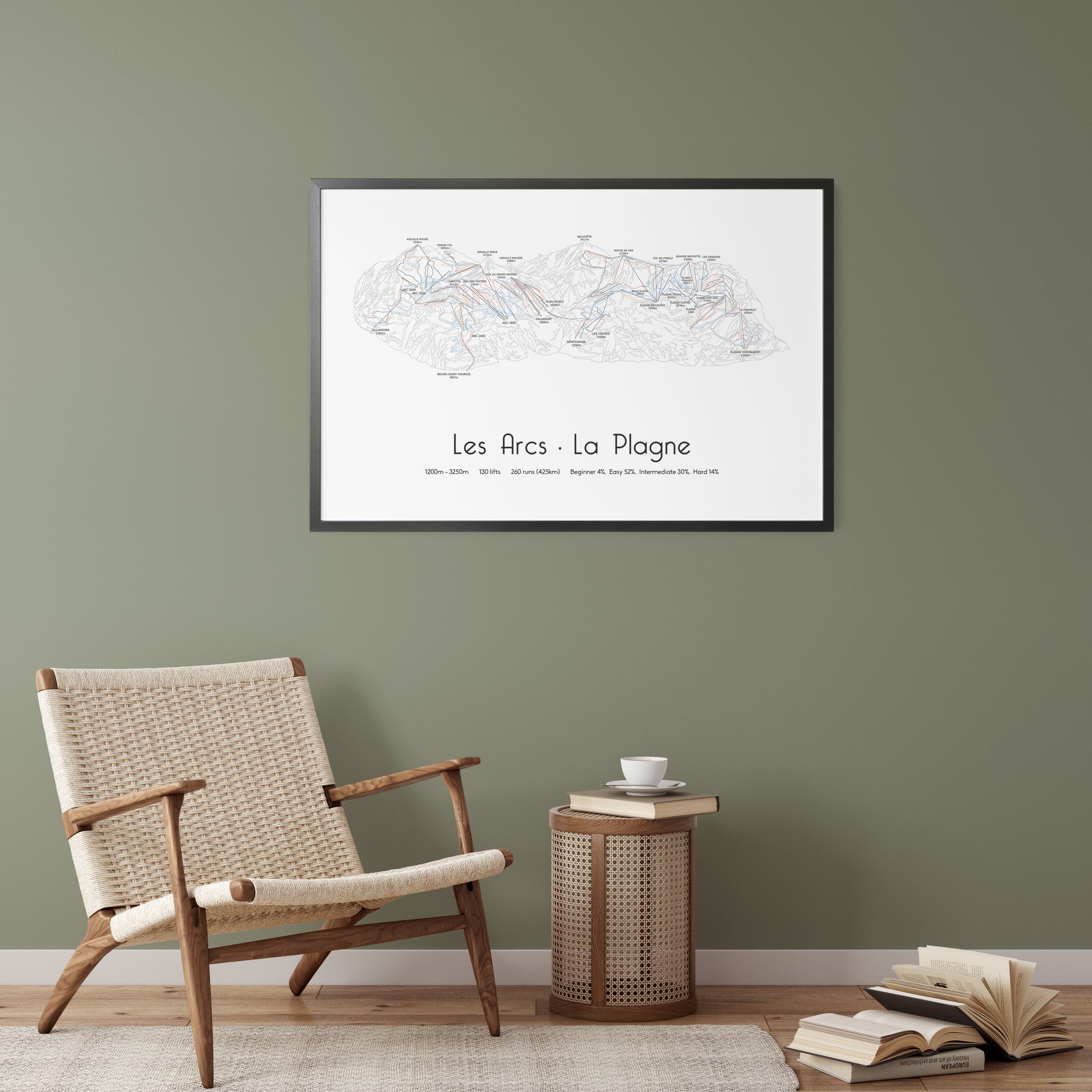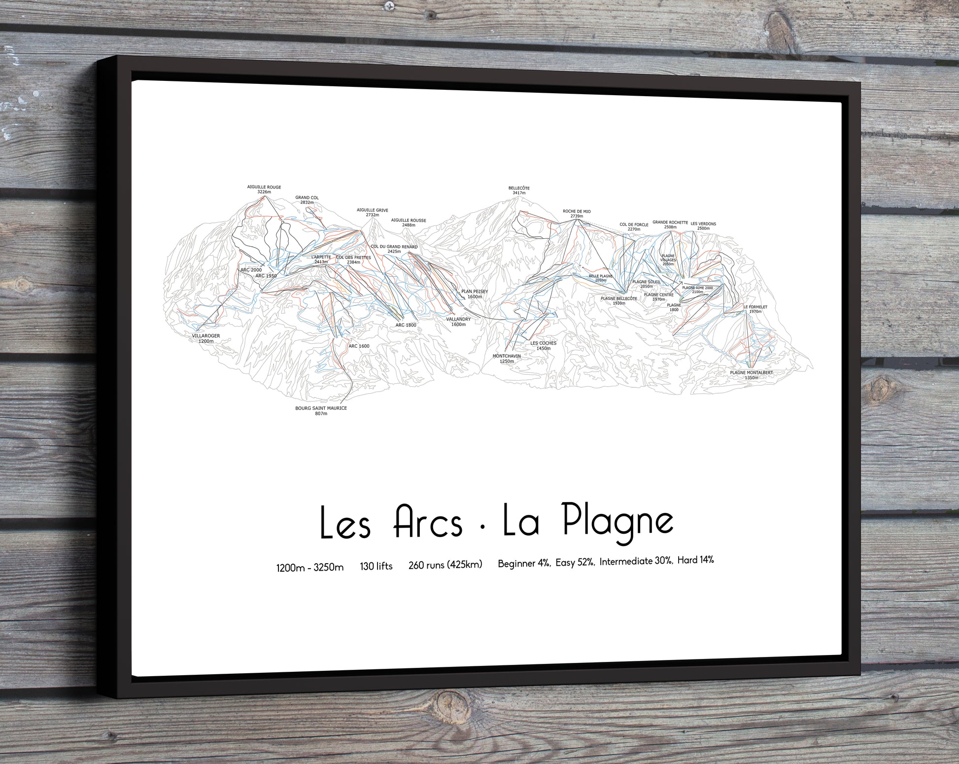 Updated for the 25/25 season. Bring the beauty of the Paradiski area into your home with our stunning ski resort print, featuring the key resorts of Les Arcs, La Plagne, and Peisey-Vallandry. This detailed piste map art showcases the vast 425 km of interconnected ski runs, spanning across two glaciers and three major resorts.