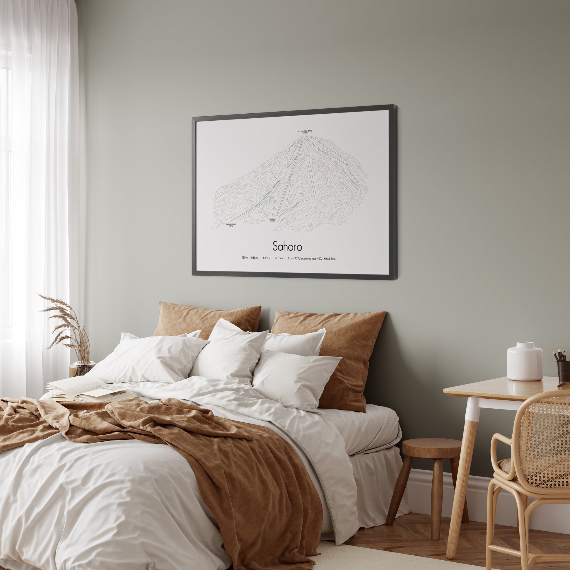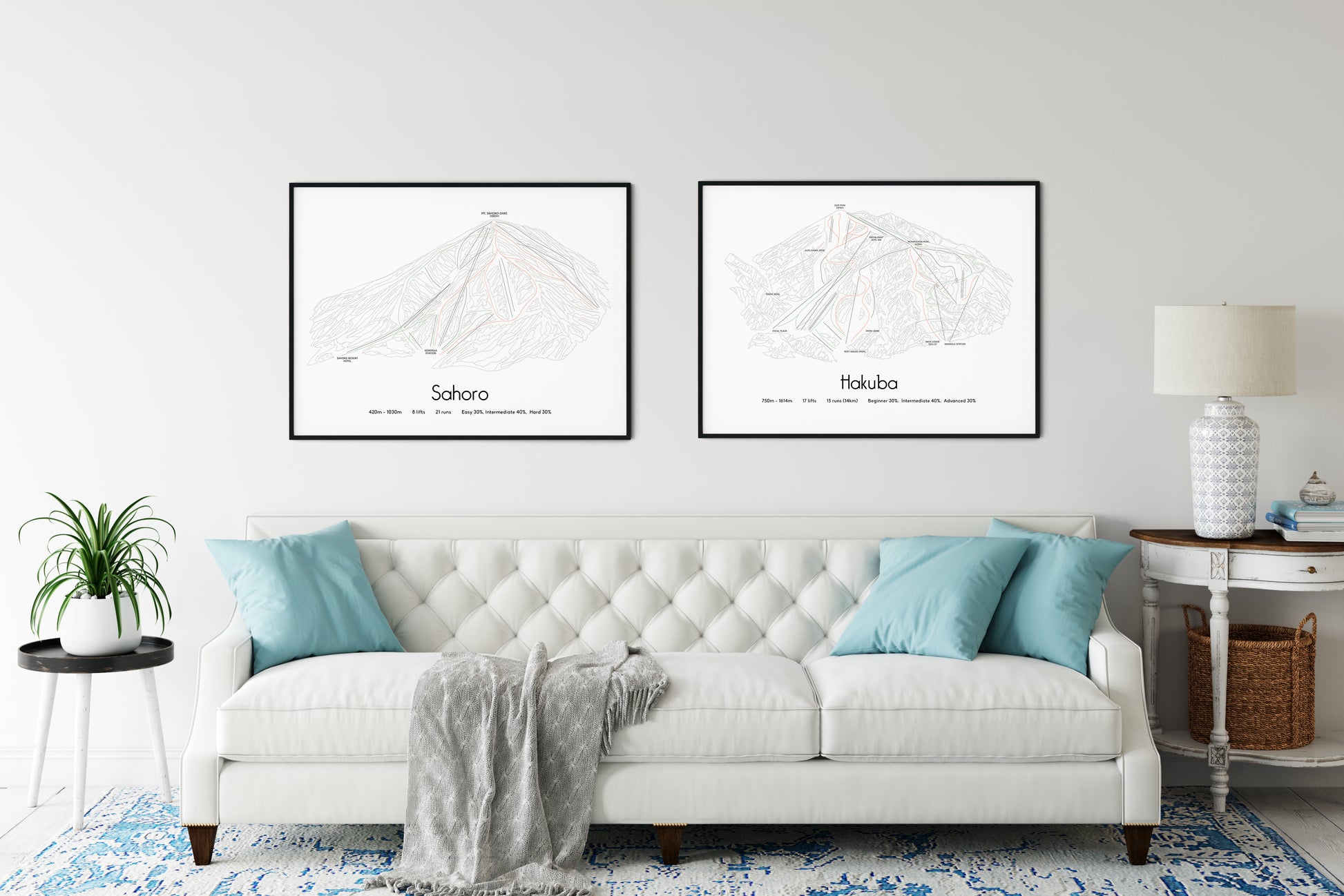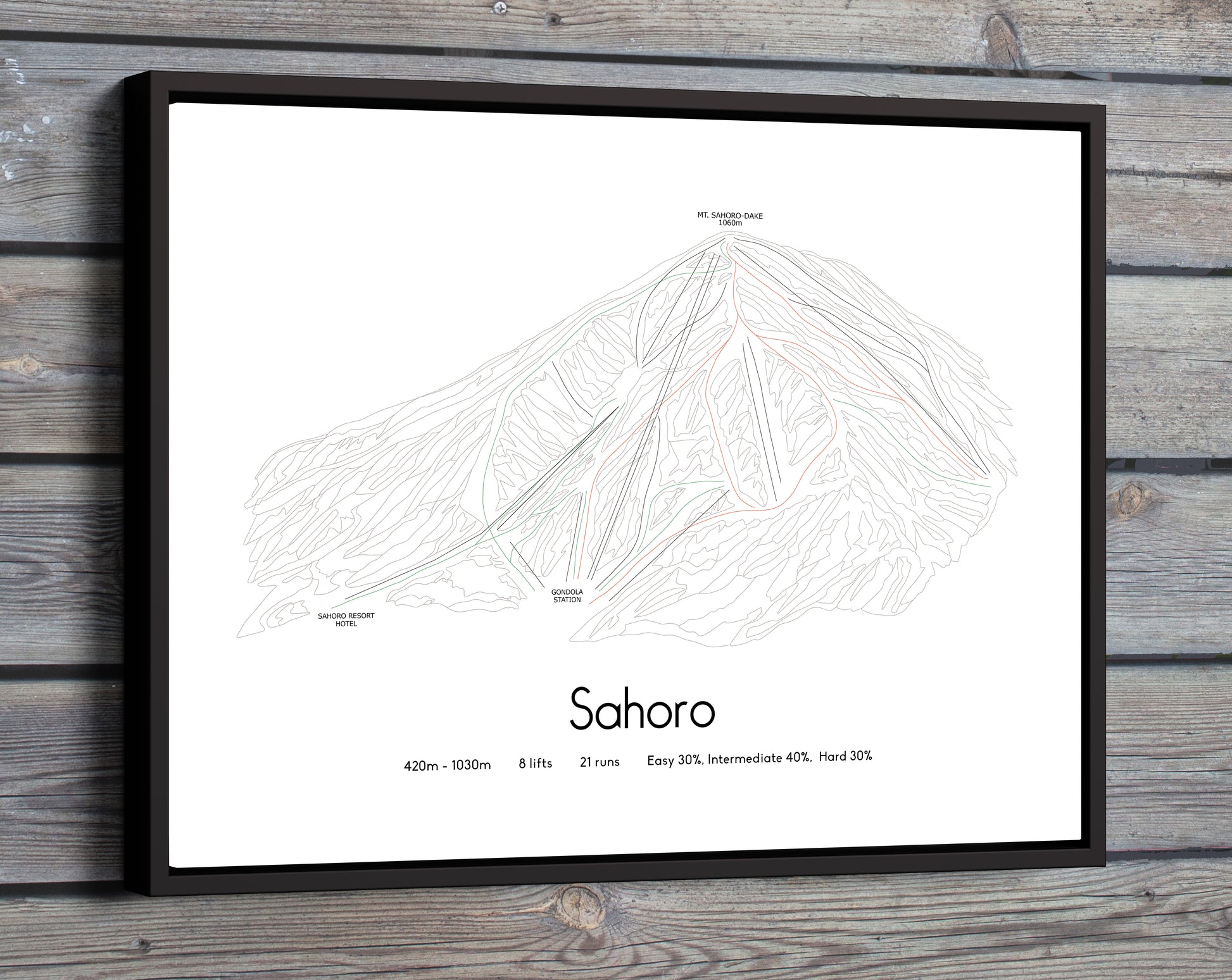 Transform your space with our stunning ski resort art print of Sahoro, featuring detailed pistes and resort statistics. Located in the central Hokkaido, you will find an amazing combination of sunny skies (50% of days) and an amazing 8.7m average of annual snowfall - powder heaven!